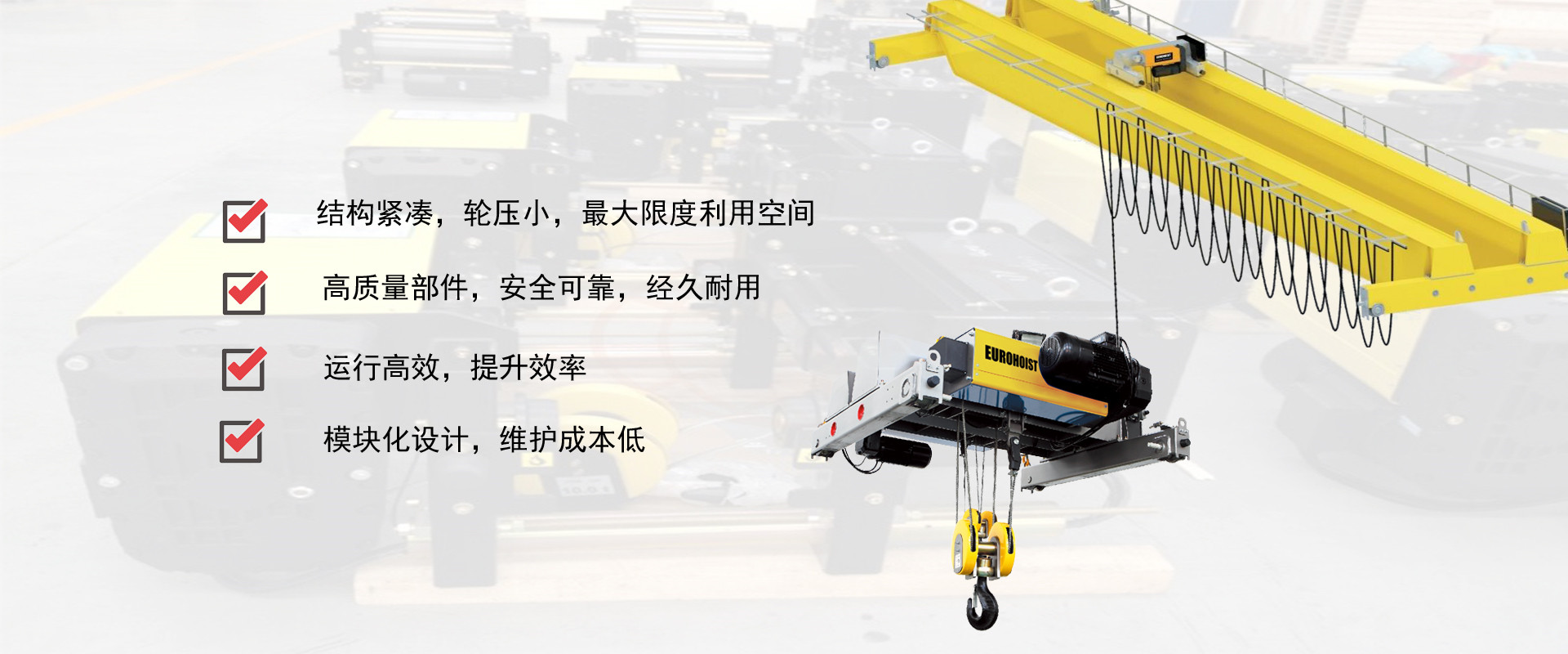 密歇爾起重機(jī)械(杭州)有限公司提供全面的起重輸送產(chǎn)品和服務(wù),產(chǎn)品覆蓋環(huán)鏈電動(dòng)葫蘆(125Kg-80T),歐式鋼絲繩葫蘆,防爆葫蘆,懸臂吊,KBK柔性起重機(jī),歐式起重機(jī),起重馬達(dá),端梁,起重移動(dòng)供電系統(tǒng)等,在國內(nèi)外被廣泛的應(yīng)用于生產(chǎn)車間,汽車,模具,機(jī)械制造,鐵路,船舶,物流搬運(yùn),現(xiàn)代化工廠流水線等工業(yè)及其它特殊用途。